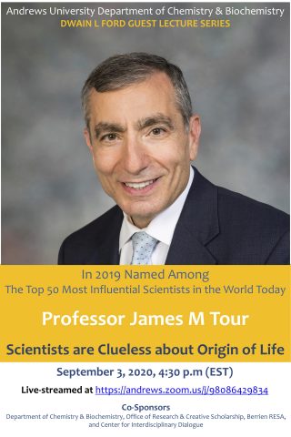 BERRIEN SPRINGS, Mich.—On Thursday, Sept. 3, 2020, the Andrews University Department of Chemistry & Biochemistry will host an online lecture by James M. Tour on the origins of life, a topic that has generated significant controversy in the field of prebiotic chemistry. Tour, who holds three professorships at Rice University in chemistry, materials science and nanoengineering, and computer science, will give a presentation titled “Scientists Are Clueless about the Origin of Life.”
