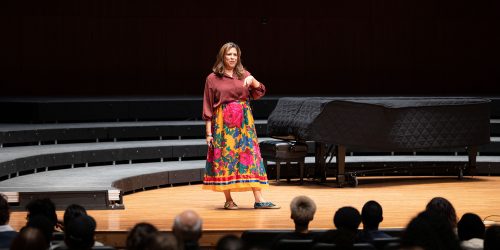 Madelene Big Bear speaks at a recent University Forum in the Howard Performing Arts Center. Photo credit: Dawson Par