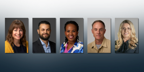 From left to right: Jessica Perry, assistant professor; Enrique Bernal Ponce, associate professor; Stella Diane Abijuru, associate professor of practice; Thomas Hurst, assistant professor, and Jussara Shultz Bauerman, professor. [Courtesy of the School of Architecture & Interior Design]