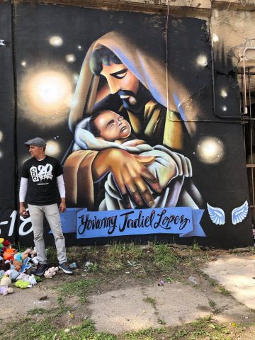 The mural painted by Milton Coronado in honor of slain 19-year old Marlen Ochoa-Lopez now includes her son, Yovanny Jadiel Lopez. On Saturday, June 22, Coronado returned to the corner of 16th Street and Newberry Avenue in the Chicago neighborhood of Pilsen to paint the image of the baby in the arms of Jesus.