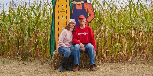 Susan and Jesse Landess at the entrance to the corn maze honoring Seventh-day Adventist conscientious objector and Congressional Medal of Honor recipient, Desmond Doss, in the 75th anniversary year of his heroic deed delivering 75 wounded soldiers to safety under heavy fire. | Photo credit: Christa McConnell