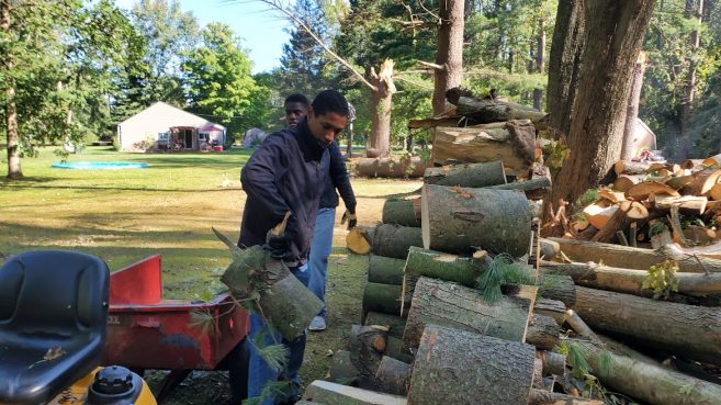 The yard was in discouraging condition. Huge trees lay everywhere, and branches and leaves littered the ground. Just a few minutes after arrival, the sound of chainsaws filled the air, and volunteers scurried back and forth, dragging branches to be burned or carrying armfuls of wood to be stacked.