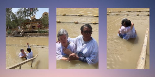 Karen Allen, dean and professor at Valparaiso University (right), baptizes Prof. Erin Stafford Dormedy in the River Jordan, the same site where Jesus was baptized.