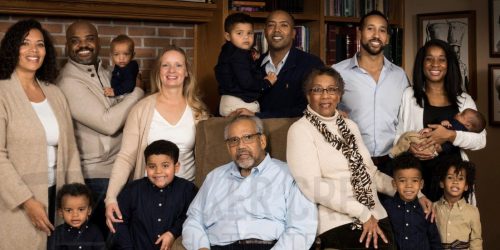Lynn Gray (seated) with his wife, Debbie, and their children and grandchildren.