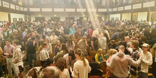 On February 10, 2023, students and visitors are shown in Hughes Auditorium at Asbury University in Wilmore, Ky. [Photo: Sarah Thomas Baldwin / Facebook]