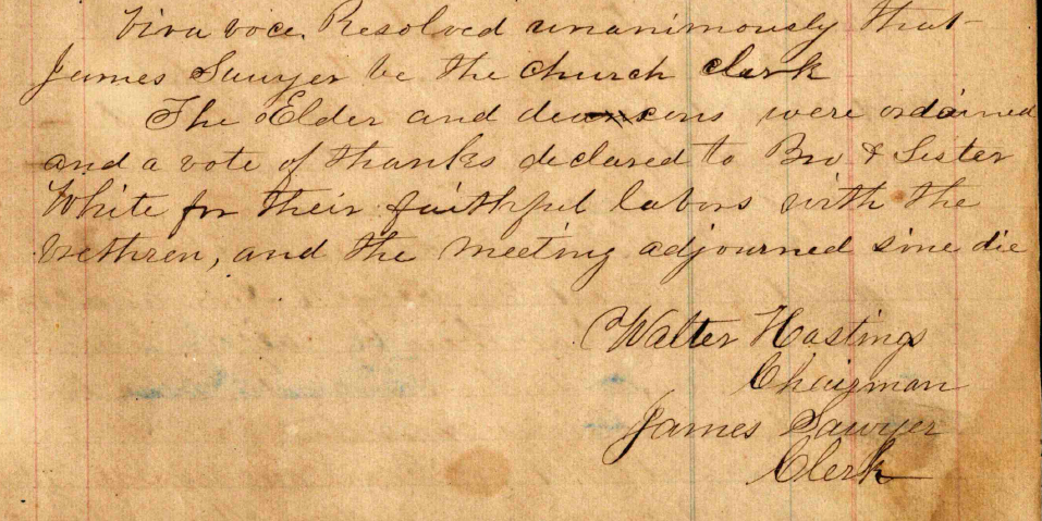 A page in the Wright Church Record Book, 1861-1877, where the Wright Church was founded on December 17, 1861. It shows James Sawyer’s name twice (voted as church clerk, and signed as clerk) and also a vote to thank "Bro. and Sister White for their faithful labors with the brethren." [PC: Courtesy of Center for Adventist Research, Berrien Springs, Mich]