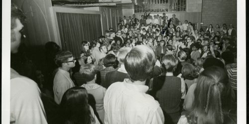 These students were among those who stayed after a chapel service in Pioneer Memorial Church to give their testimonies and tell of their new enthusiasm for Christ. The chapel was a follow-up on the Campus Concern Retreat held October 8 -11. Photo by Horace Shaw. DATE: October 15, 1970. [Adventist Digital Library]