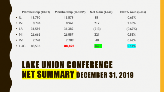 Executive Secretary, Steven Poenitz shared that the net increase in Lake Union membership for 2019 was 362, representing a 0.41% growth. Membership is now at 88,898.