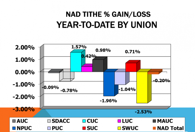 Across North America in 2019, tithe was down 0.20% (slide below), so “I praise God for the faithfulness of our people,” said Lake Union Treasurer, Glynn Scott.