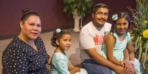 Olga Jimenez with her kids Alani, 6, and Aline, 9, and her husband, Mauricio, in the South Bend Hispanic Seventh-day Adventist Church. | Tribune Photo/Robert Franklin