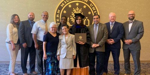 Western Michigan University administrators present Lusanni Acosta with diploma at special graduation ceremony. (L-R) Dr. Christopher Cheatham, interim provost, and vp for academic affairs; Dr. Edward Montgomery, president; Dr. Diane Anderson, vp for Student Affairs; Dr. Lusanni Acosta; Jeremy Hall, superintendent, Michigan Conference; Jorge Rodriguez, professor; Steven Butt, dean, College of Engineering and Applied Sciences.