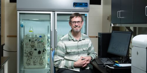 Department of Biology professor Peter Lyons serves as principal investigator for the department’s research on proteolytic enzyme activity. Photo credit: Darren Heslop