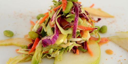 The surprising addition of fresh pear lifts the flavor profile of this salad from coleslaw into a special dish. With more research pointing toward the benefits of cruciferous vegetables, a serving of this cabbage-rich salad will help your heart, cholesterol and overall health — and a tasty way to deliver good nutrition. The dressing is a uniquely Asian combination of sweet, hot, salty and sour that can be used at many other meals. Bright green soybean edamame can be found precooked in your grocer’s freezer section.