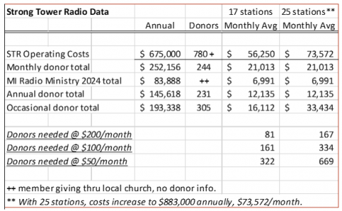 Seventeen stations’ costs were covered by over 780 donors, of which 305 gave occasionally. Growing to 25 stations will increase annual costs $208,000 and increase broadcast signal reach by one million people. Stable monthly funding calls for 322 donors giving $50/month and with 25 stations, 669 donors at $50/month. Supremely economical, this averages $.015/person/month to reach 4.8 million people living within broadcast coverage of the everlasting gospel.
