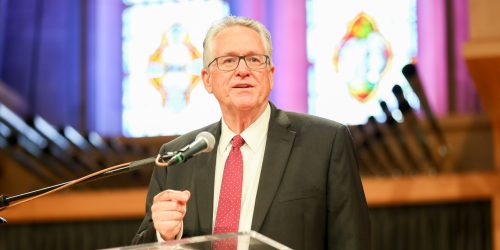 Lake Union Conference President Ken Denslow shares his President's Report during the Quinquennial Constituency Session held on May 15, 2022, at the Pioneer Memorial Church in Berrien Springs, Michigan. l Photo credit: Katie Fellows