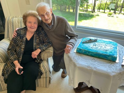 The Johnstons celebrated their 65th anniversary in Berrien Springs with their family. A local bakery prepared a cake for the celebration decorated to look like an ocean. Sitting on the ocean was a small replica of the ship, The President Monroe, and the words, “With Jesus in the ship—65 years of smooth sailing.”
